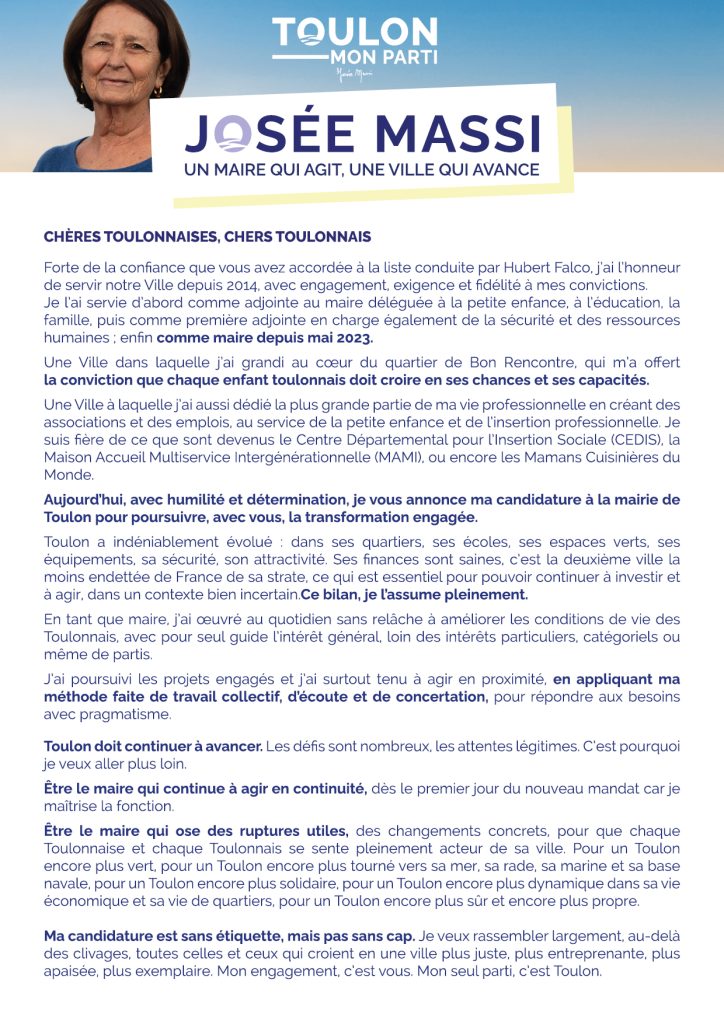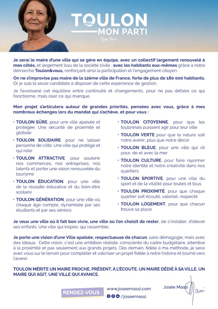 Josée Massi se représente pour poursuivre et approfondir le travail engagé au service de Toulon. Sa candidature s’inscrit dans une volonté de continuité utile, de stabilité, de responsabilité et de ruptures utiles. Afin de mener à bien les projets structurants pour la ville et d’accompagner les transitions nécessaires, notamment en matière de cadre de vie, de solidarité et d’environnement.